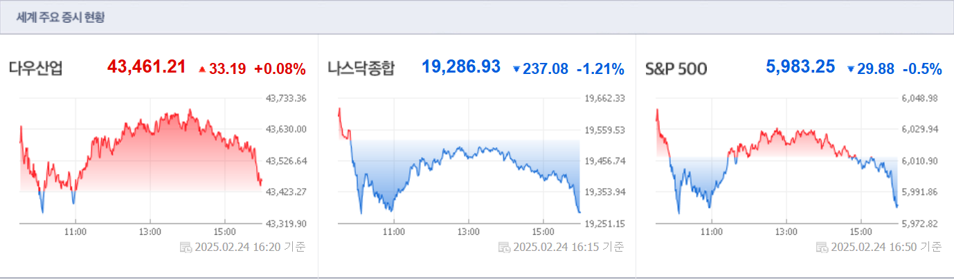 2025년 2월 24일, 뉴욕증시에서 주요 지수는 혼조세로 마감하였으며, 기술주 중심의 나스닥 종합지수는 1% 넘게 하락하였습니다. 특히, 인공지능(AI) 관련 종목들의 부진이 두드러졌습니다.