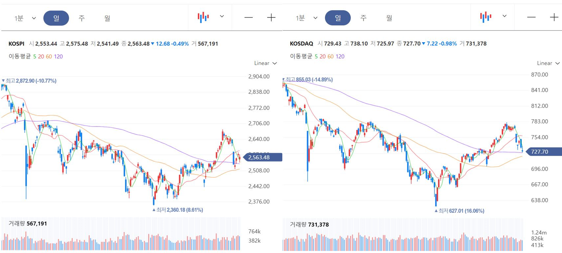- 종가 : 2,563.48 포인트 (-12.68포인트, -0.49%)