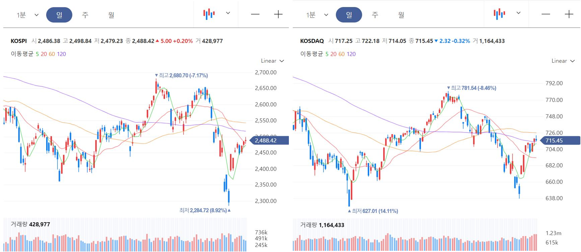 - 종가 및 등락폭: 715.45P (-2.30P, -0.32%)