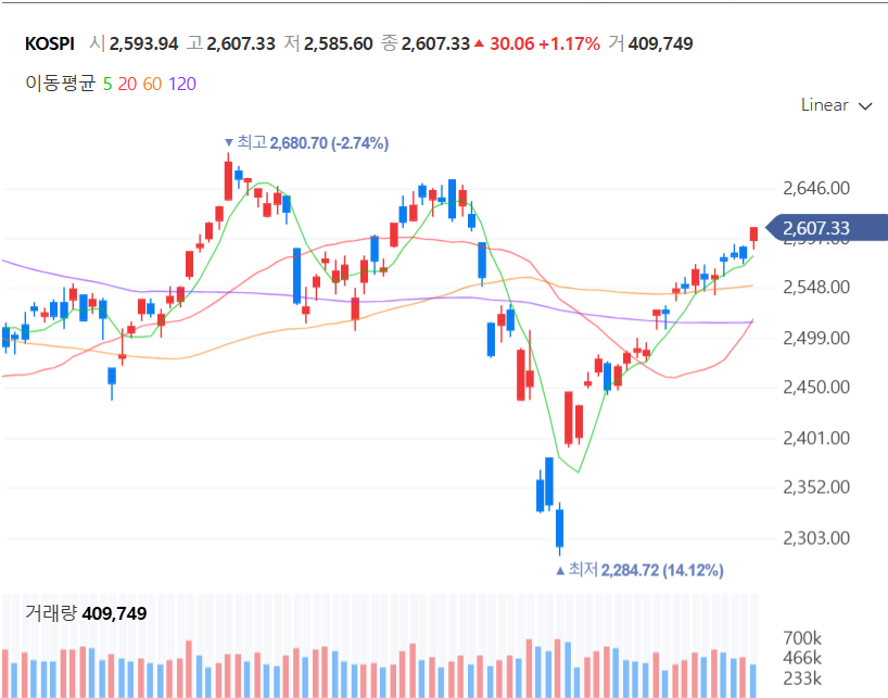 - 종가: 2,607.33p (+30.06p, +1.17%)