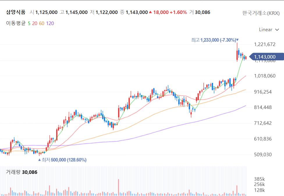 삼양식품은 '불닭볶음면'의 세계적인 인기에 힘입어 2023년 초 11만 5,000원이던 주가가 2025년 5월 기준 114만 3,000원으로 약 10배 상승했습니다. 이는 인공지능(AI)이나 양자 기술주가 아님에도 불구하고 '텐베거(10배 오른 주식)'가 된 사례로 주목받고 있습니다.