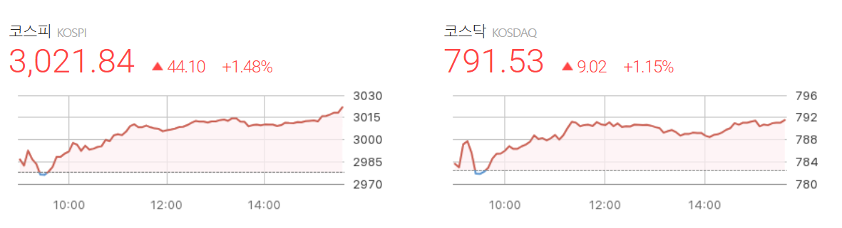 - 종가: 3,021.84p (+44.10p, +1.48%)