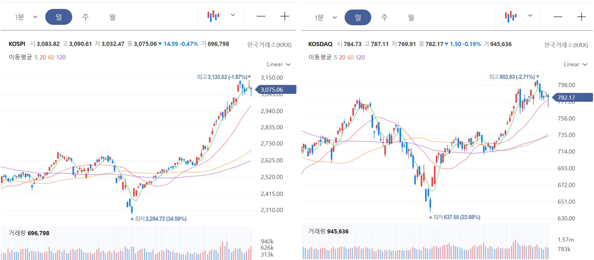 - 종가 및 등락폭: 782.17P, -1.50P (-0.19%)