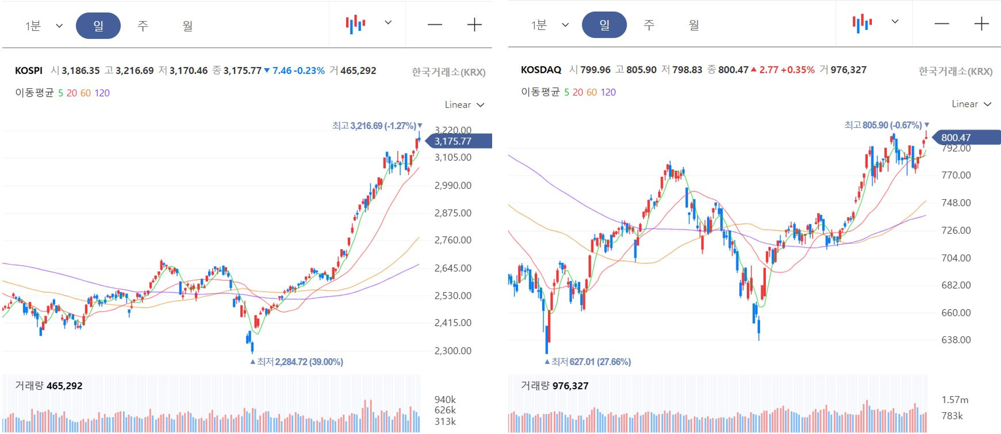 - 장중 3,200선을 돌파하며 연고점을 경신했으나, 차익실현 매물에 밀려 하락 마감