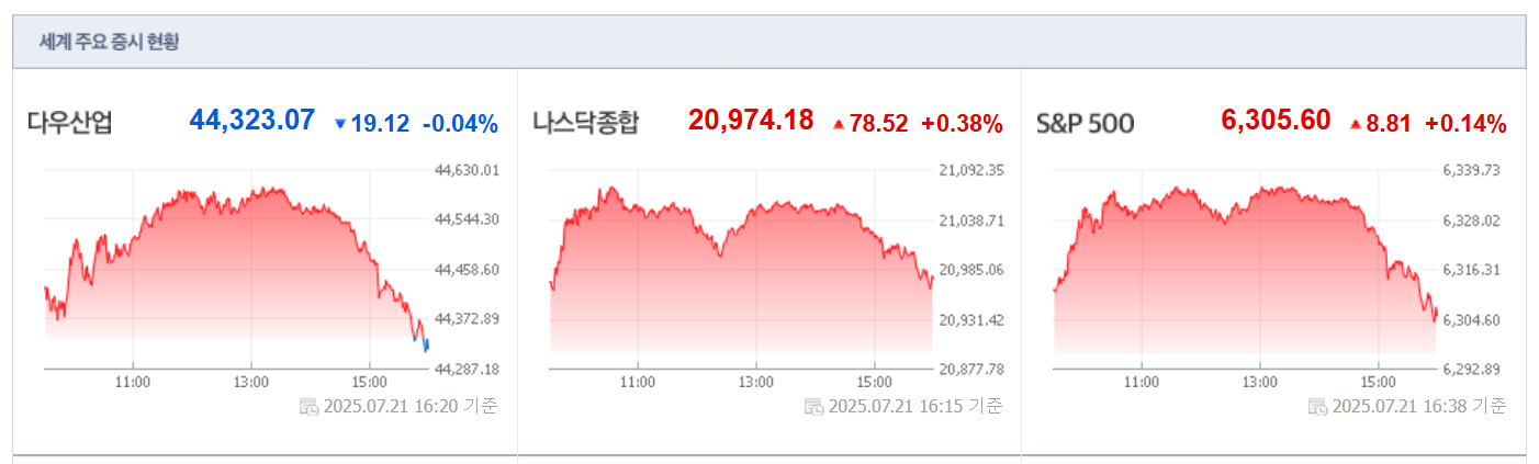 ● 주요 지수 마감 현황 (미국 기준, 7/21/2025)