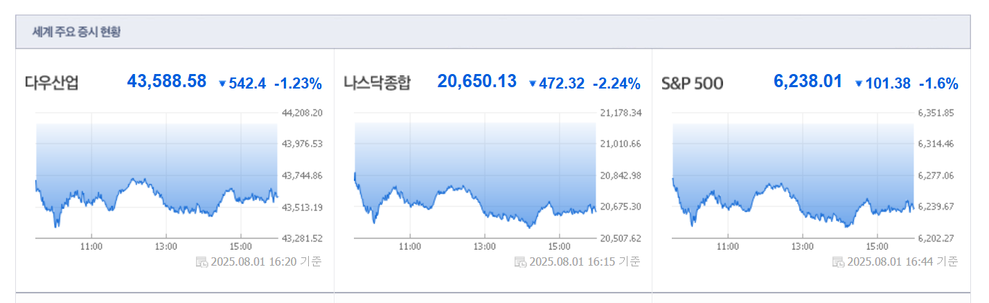 ● 주요 지수 마감 현황 (미국 기준, 8/1/2025)