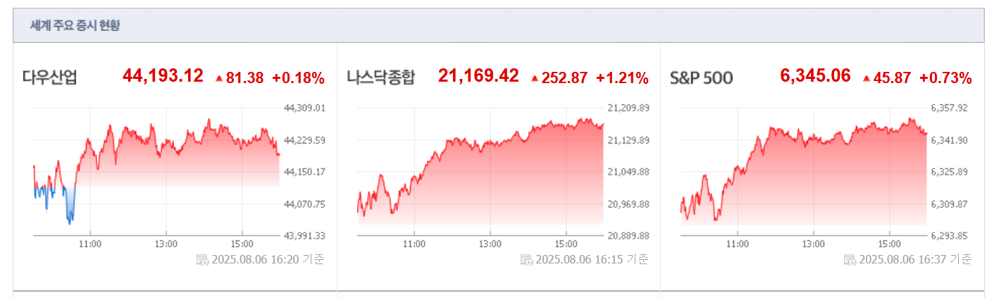 ● 주요 지수 마감 현황 (2025년 8월 6일, 미국 기준)