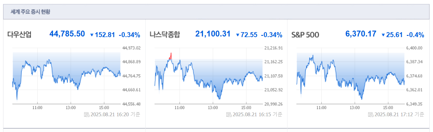 ● 주요 지수 마감 현황 (2025년 8월 21일, 미국 기준)