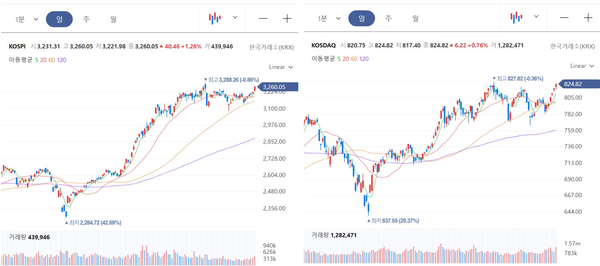 미국 금리 인하 기대와 대주주 요건 완화 검토 소식에 힘입어 코스피는 3,260선, 코스닥은 824선에서 마감하며 6거래일 연속 상승을 이어갔다.