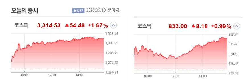 9월 10일 국내 증시는 주식 양도세 대주주 기준 완화 기대감과 국민성장펀드 확대 소식에 힘입어 강세를 이어갔습니다.코스피는 7거래일 연속 상승세를 보이며 3,314.53p로 사상 최고치를 새로 썼고, 코스닥 역시 외국인·기관 동반 매수세에 힘입어 833p까지 오르며 상승 흐름을 이어갔습니다.