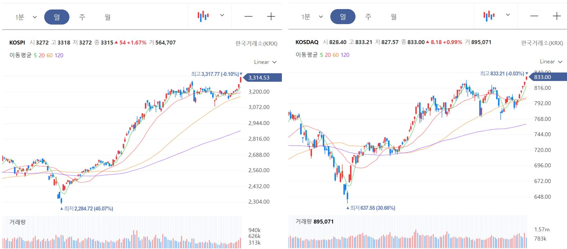 - 종가: 3,314.53 (+54.48P, +1.67%)