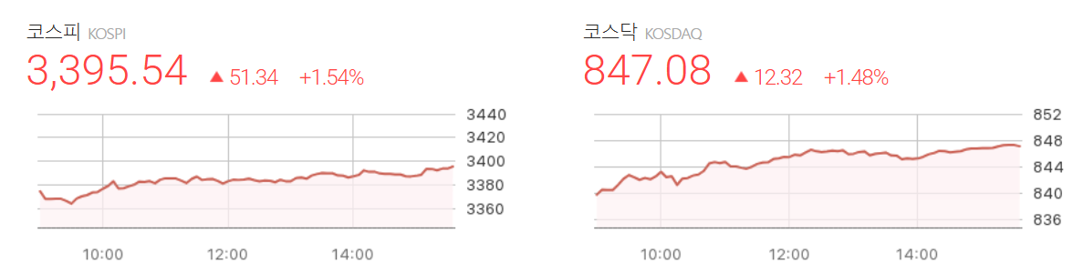 - 종가: 3,395.54p (+51.34, +1.54%)