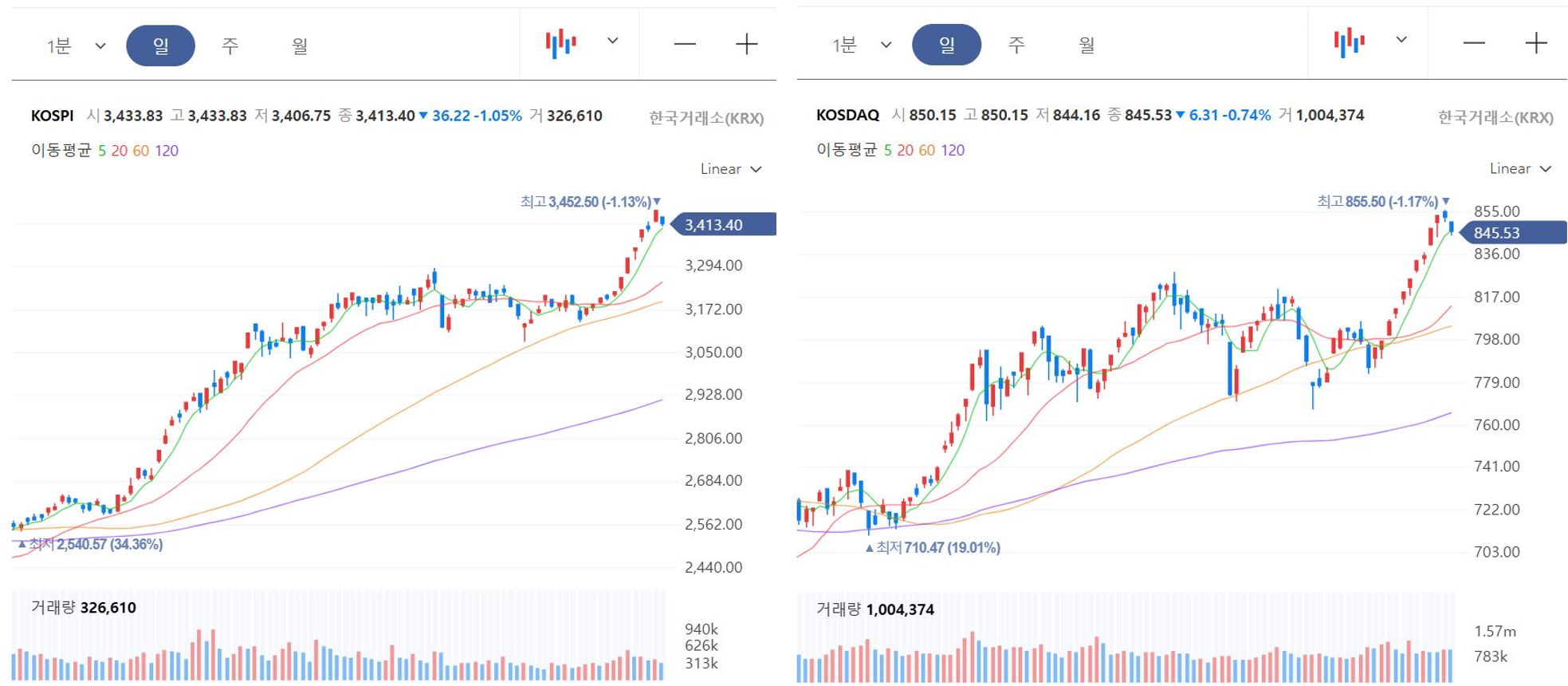 - 종가: 3,413.40p (-36.22, -1.05%)