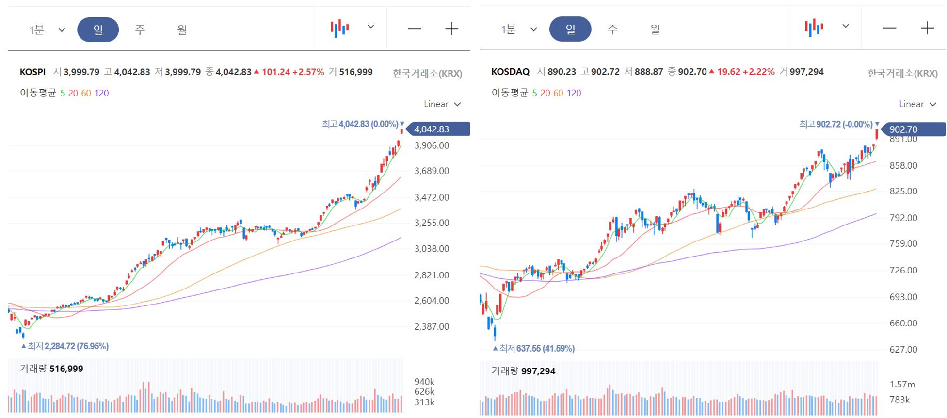 - 외국인·기관 동반 매수세로 코스피 4,000·코스닥 900선 동시 돌파