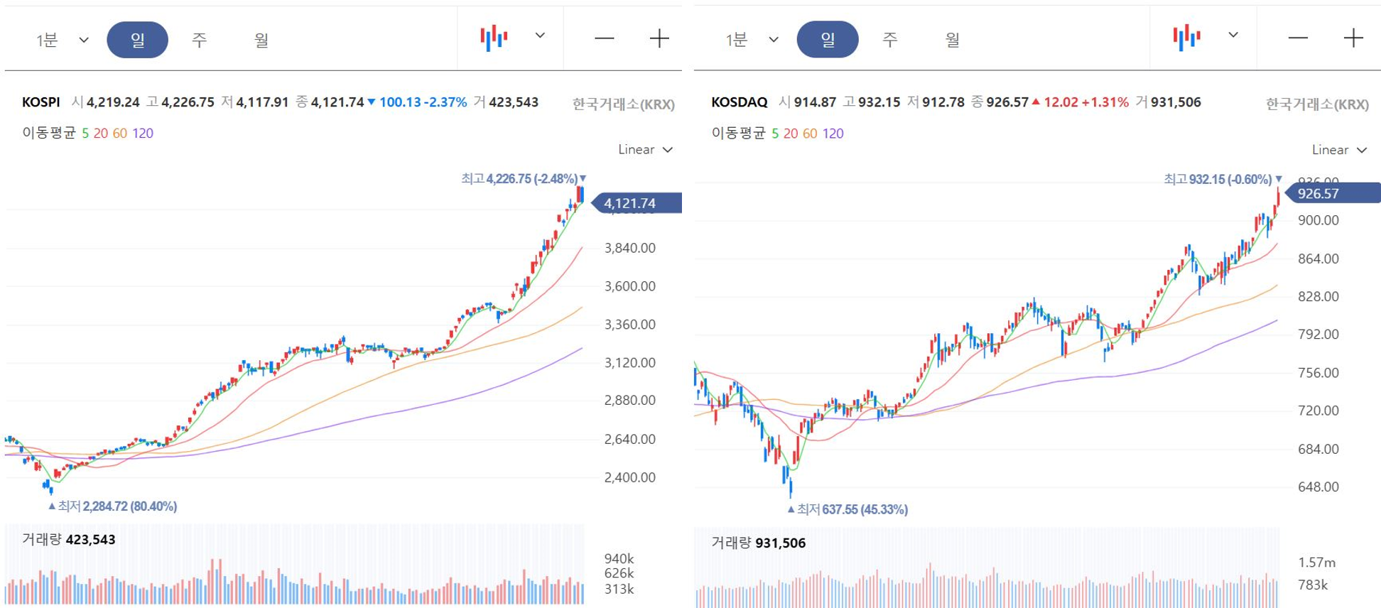 외국인 대규모 매도 속 코스피는 2% 이상 급락했지만, 코스닥은 제약·바이오 강세로 3거래일 연속 상승 마감하며 대조적인 흐름을 보인 하루.