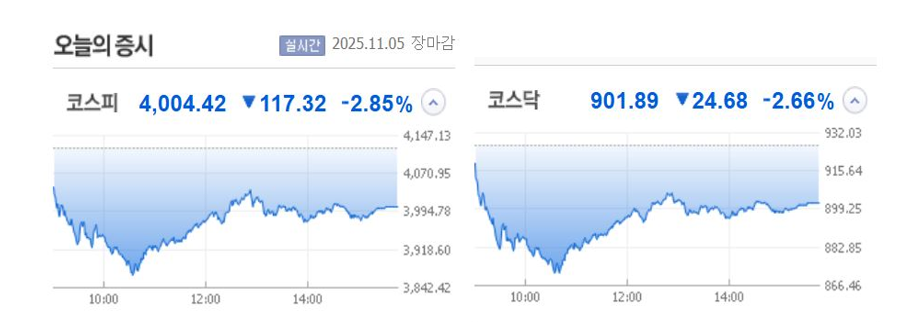 2025년 11월 5일 국내 증시는 글로벌 AI 거품론 여파로 급락세를 보이며, 코스피와 코스닥 모두 큰 폭의 하락세로 마감했습니다. 전일 미국 증시가 인공지능 관련주를 중심으로 급락한 여파와 외국인·기관의 대규모 순매도가 시장 전반에 투자심리 위축을 불러왔습니다.코스피는 4,004.42(-2.85%)로 마감하며 4,000선을 간신히 지켰고, 코스닥 역시 901.89(-2.66%)로 급락하며 900선 위에서 겨우 버텼습니다.특히 이날은 7개월 만에 ‘매도 사이드카’가 발동될 정도로 변동성이 극심했던 하루였습니다.
