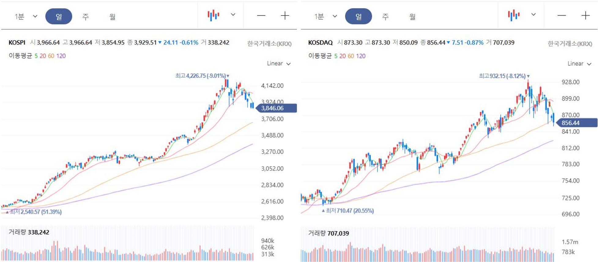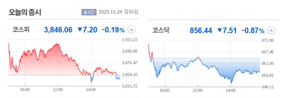 증시 요약 : 2025년 11월 24일 코스피·코스닥 마감