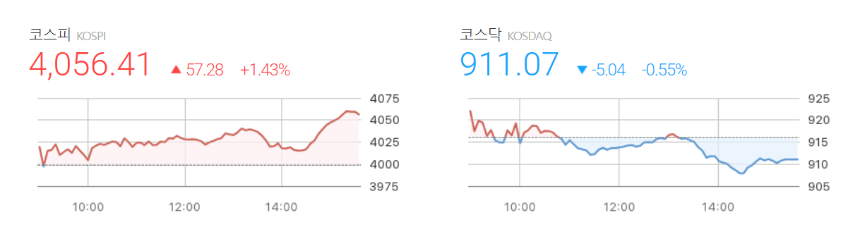 - 종가(등락폭)코스피 지수는 4,056.41포인트(+1.43%)로 마감