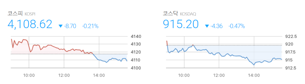 - 코스피 지수는 4,108.62포인트(-0.21%)로 마감하며 4거래일 만에 하락 전환했습니다.