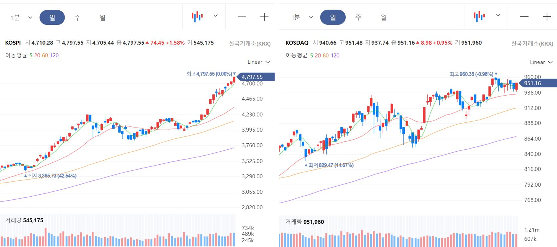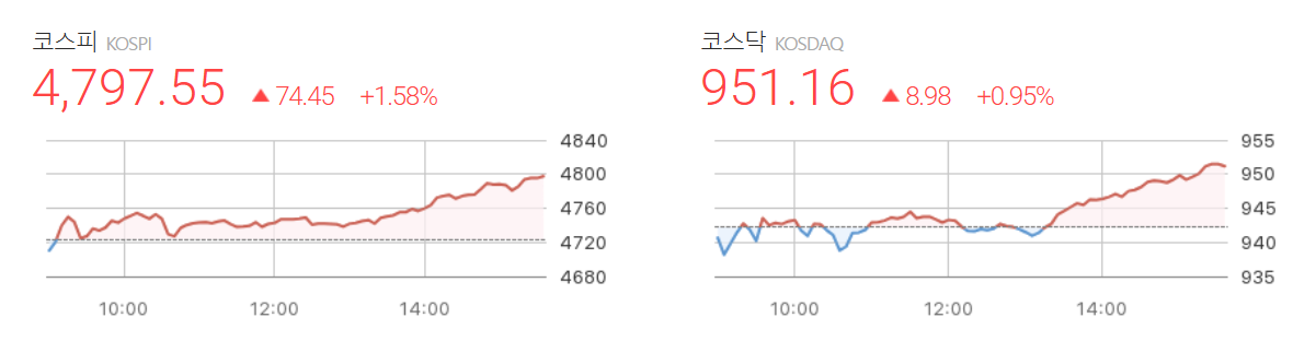 - 종가: 4,797.55pt (+74.45pt / +1.58%)