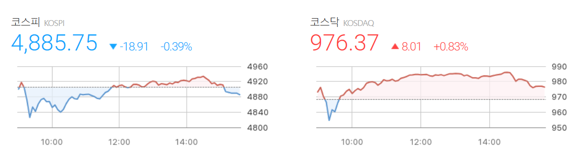 - 종가: 4,885.75pt (-18.91pt / -0.39%)