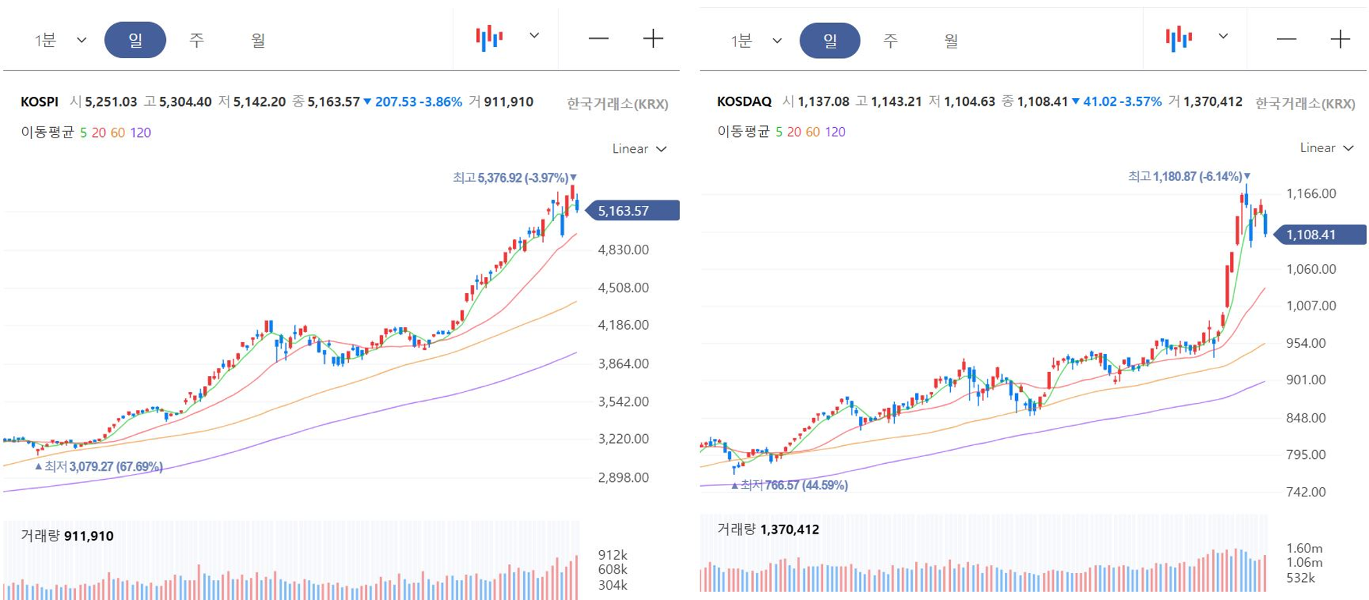 - 종가(등락폭)코스피 지수는 5,163.57포인트(-207.53p, -3.86%)로 마감하며 3거래일 만에 급락 전환했다.