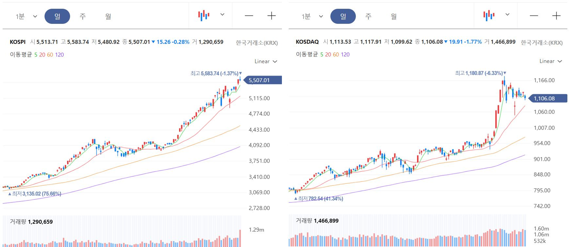 - 종가(등락폭)KOSPI 5,507.01P (-15.26P, -0.28%)